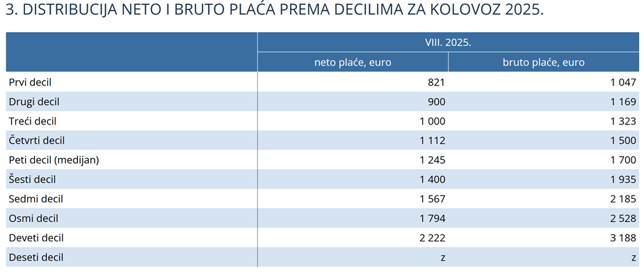 Medijalna neto plaća za kolovoz 2025. iznosila je 1 245 eura, što je u odnosu na isti mjesec prethodne godine više za 9,8%.
