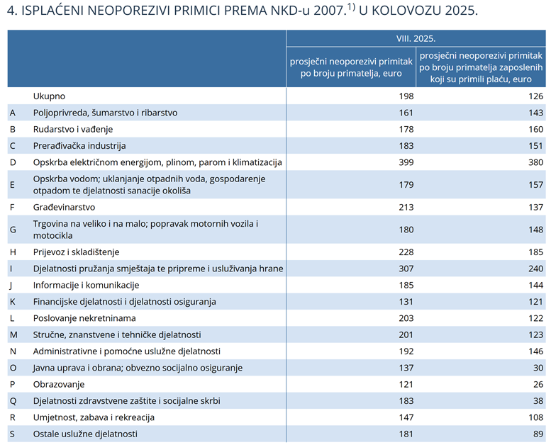 Prosječna mjesečna isplaćena neto plaća po zaposlenome u pravnim osobama Republike Hrvatske za kolovoz 2025. u odnosu na isti mjesec prethodne godine nominalno je viša za 9,2%, a realno, kada se uzme u obzir utjecaj inflacije, za 4,9%.