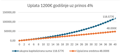 Pogledajte primjer na temelju godišnje uplate od 1.200 € u razdoblju od 40 godina ako fond nosi 4% ili 6% prinosa: