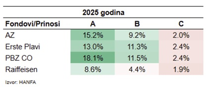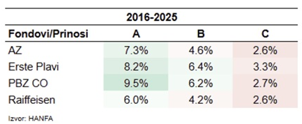 Pogledajte prinose fondova u 2025.godini i u desetgodišnjem razdoblju od 2016.godine do 2025.godine uz napomenu da dosadašnji prinosi nisu garancija budućih prinosa.