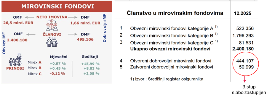 Hrvatski mirovinski sustav sastoji se od I. i II obveznog mirovinskog fonda - OMF o kome smo opširno pisali u tekstu Kako do veće mirovine , te od III. dobrovoljnog fonda - dobrovoljne mirovinske štednje. Prema podacima iz prosinca 2025. godine od ukupno 2.400.180 osiguranika u obveznim mirovinskim fondovima, tek 495.106 osoba štedi i u III. mirovinskom fondu.